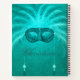 Features a masquerade mask topped with a fan of feather and dangling tassels on the sides. Done in a dark teal turquoise and white. An elegant design. Personalised if you wish.