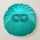 Features a masquerade mask topped with a fan of feather and dangling tassels on the sides. Done in a dark teal turquoise and white. An elegant design.