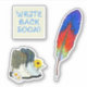 Shaped stickers for pen pals. Hand-drawn feather pen in red and blue. His and hers cowboy boots decorated with little daisies. A square sticker asking for a friend to "write back soon". Old school pen pal stickers for envelopes, paper, or postcards. The example sheet size is 4x4 inches, and the stickers will be small, or change the size of the sheet.