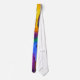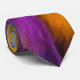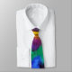 A unique fun and funky tie with purple,orange,yellow,blue and green feathers.