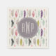 A gift featuring a pattern of illustrations of feathers with a chevron background. Personalise with your monogram over purple circle.