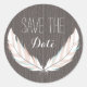 A save the date sticker featuring an illustration of a pair of feathers. Background is barnwood inspired.