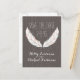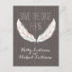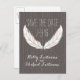 A wedding save the date postcard featuring an illustration of a pair of feathers. Background is barnwood inspired. Personalise the text.