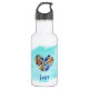 A whimsical water bottle with a cute watercolor design of heart made with feathers And a bright blue watercolor paint splatter behind. Personalise with a name.