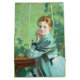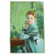 This design features a painting by the Scottish artist George Henry (1858–1943), who was one of the most prominent members of the Glasgow School of art. It is a portrait of a beautiful young woman named Felicity. She is seated at a table and she is wearing a turquoise-blue dress. Her elbows are resting on the table and she is holding her hands together beside her face. Felicity is starting intently at the viewer. She is clearly an elegant woman. Her chestnut-brown hair is fashionably styled and she is wearing a scarf over her dress, that is a slightly darker shade of turquoise than the dress itself. There is greenery in the background, suggesting that she is sitting outside in a garden. The original artwork was painted by George Henry in 1916.