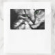 Black and white photograph of a green-eyed tabby cat cuddling an adorable little kitten.