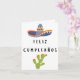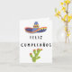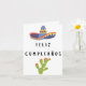 Spanish birthday card (tarjeta de cumpleaños) with birthday message in Spanish (Feliz Cumpleaños, happy birthday in Spanish) and traditional Mexican style illustration of sombrero and cactus. Includes birthday message inside card, 'Feliz Cumpleaños'.