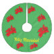 Poinsettia Christmas tree skirt with wording Feliz Navidad. This beautiful tree skirt may be just what your Christmas tree needs.
