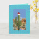 "Feliz Navidad!" Folded Christmas Greeting Card. Celebrate the holiday season with a unique Southwestern twist! This festive card features a charming desert scene on the front, where a saguaro cactus proudly wears a Santa hat, and is surrounded in a beautiful turquoise coloured tile frame, bringing a touch of Christmas magic to the arid landscape. Inside, two joyful llamas dance together, spreading warmth and cheer with the caption "Feliz Navidad!" Whether you're sending holiday wishes to loved ones near or far, this card captures the spirit of Christmas with a delightful mix of tradition and whimsy. Perfect for anyone who appreciates a blend of holiday cheer and desert charm!