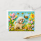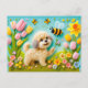 delightful felt dog surrounded by colourful spring flowers and buzzing bees. This impressionist wool artwork radiates warmth and joy, celebrating nature's beauty.