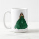 Female Capricorn goddess fashion illustration artwork on a mug. The illustration features a woman in a beautiful green emerald ball gown. She has silver goat horns and a silver tiara. This earth sign female illustration mug is ideal for females born during the Capricorn season. Customise the word "Capricorn" with a name if you prefer to give a more personalised touch to it.