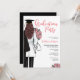 Female Medical School Graduation Party Invitation. The perfect doctor or nurse grad party Invitation for your daughter, niece, mother, aunt, cousin, or friend. Female Med School Graduation Invitation for grad parties celebrating women who just graduated from school of medicine, school of nursing or other medical profession certification. Featuring a portrait of woman with long brown hair, wearing lab coat with black graduation robe draped over one shoulder, and a bouquet of pretty pink flowers in her other hand, with a doctor's stethoscope slung around her arm. Pink script typography accents.