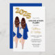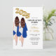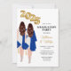Female Twins Graduation Party Invitation for twin sisters double graduation combined graduation party celebration. Portrait of twin women with long brown hair in white dress with navy blue graduation gowns and grad caps with gold balloons for class of 2025.