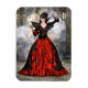 3D digital render of a beautiful female wizard in a red and black dress with wings on a fantasy spooky castle background