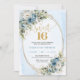 Celebrate a milestone moment with this elegant Sweet Sixteen invitation, featuring a refined watercolor design of dusty blue florals blended with soft white flowers and fresh eucalyptus greenery. Framed by a shimmering gold glitter border and paired with graceful script lettering, this invitation sets a sophisticated tone for a truly unforgettable Sweet Sixteen, Sweet 16th, or 16th birthday celebration.
