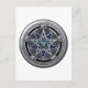 A silver feminine energy pagan pentacle surrounded by a silver ring on a silver wood shield. Chalices, a central medallion, blue water jewels, triple goddesses and celtic knotwork. Designs by Naumaddic Arts.