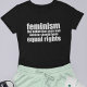 Feminism definition on a t-shirt. The belief that men and women should have equal rights. Progressive perspective to some. Welcome to the 21st century where women's rights are important. Fight for equality in the workplace and equal pay.