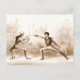 Fencing with Death postcard: this vintage death art is by Alexander ver Huell 1822-1897 a Dutch illustrator with a macabre style. It depicts a young man fencing with Death. He executes a lunge straight for the heart which death snatches with his off hand as he prepares his own mortal blow. A living room can be seen in the background with books and a book case, a comfortable chair/sofa, maybe a footstool with the mans hat and coat laying on it and a painting and other wall hangings.