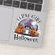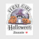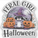 A cute racoon wearing a witch hat sits among carved pumpkins and autumn leaves under a crescent moon, with the words "Feral Girl Halloween" in the background.