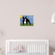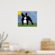 Ferdie the French Bulldog is a cute black and white cartoon style dog, standing in a happy scene. The simple poster is bright and cheerful featuring the dog on green grass, puffy white clouds, blue textured background sky, yellow sun and bird silhouettes flying over head. .