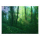 Rays of the morning sun streaming into a brilliantly green summer forest, with massive ivy-covered trees and a thick blanket of underbrush. A photograph digitally manipulated to give the over-grown vines, blue-green mist, golden god-rays, and spring green tree leaves a dream-like quality.