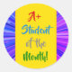 This festive, encouraging sticker design features the message "A+ Student of the Month!". A sticker like this might be used to help motivate a student. [~Z0000317]