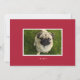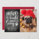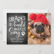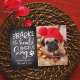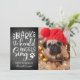 Adorable holiday photo card for dogs features a favourite image of your four legged friend aligned at the right, with "Bark! The herald angels sing" in white hand lettered typography on a rustic chalkboard background. Personalise with your custom greeting and names beneath (shown with "happy pawlidays"), and add an additional photo to the back.