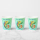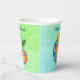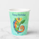 These paper cups are mix of shades of blue and green with a festive fantasy lizard in bright colours of green, blue, yellow, orange holding a green leaf on a stick. Customise the Happy Birthday text with the templates on the front and back.