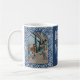 Festive blue hand drawn boho pattern, 2 photo family holiday mug. Design features two arch frame photo spaces, Bright and Merry word-art logo, text lines for family name and year.