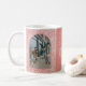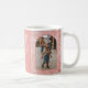 Festive pink hand drawn boho pattern, 2 photo family holiday mug. Design features two arch frame photo spaces, Bright and Merry word-art logo, text lines for family name and year.