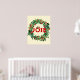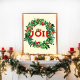 Big word "JOIE", French for "joy" inside rich evergreen blue and red berry wreath on cream background for effective and festive home décor.