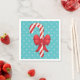 This napkin features Destei's festive and cute red and white cartoon illustration of a delicious Christmas candy cane with a beautiful red bow. The background colour is blue with a snowflake pattern.