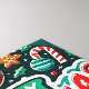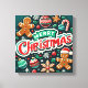 This vibrant and festive image features a cheerful "Merry Christmas" message surrounded by classic holiday elements. The design includes smiling gingerbread men, colourful Christmas ornaments, candy canes, snowflakes, holly leaves, and stars, all set against a rich green background. The playful and whimsical style of the artwork captures the joy and spirit of the holiday season, making it perfect for Christmas cards, decorations, or festive apparel.