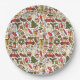 Paper plates covered in a detailed Christmas doodle pattern with snowmen, trees, mittens, bells, gifts, candy canes, mugs, candles, stars, and festive cars. Perfect for winter gatherings, holiday meals, and joyful celebrations.