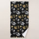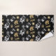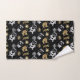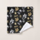 Cute Christmas themed bath towel set design featuring snowflakes, Santa Claus, Christmas socks and snowmen in faux gold and silver on black background.