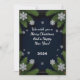 Elegant holiday frame with green pine branches and sparkling silver snowflakes against a dark backdrop, perfect for festive greeting cards or cheerful seasonal designs.