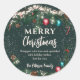 This Christmas sticker features a classic and festive holiday design with pine branches adorned with ornaments, pinecones, white berries, and candy canes. Set against a rich dark green background with delicate snowfall accents, the sticker includes a personalised message of "Merry Christmas" and warm holiday wishes. The circular format makes it perfect for adding a charming touch to gift wrapping, envelopes, or holiday party favours.