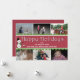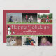 Stylish multi-photo flat style Christmas greeting card, with photograph slots for six pictures you want to share with friends and family. A muted red decorative band, across the middle of the card, has a green scalloped edge and cute doodle style graphics of a snowman and bird, on the left side. White graphic text reads Happy Holidays, and white text below is ready to personalise. Great way to share your year in photos with everyone on your holiday card list.