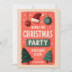 Charming Christmas party card with Santa hat, ornaments, candy cane and decorated trees on a warm red background, perfect for a joyful holiday celebration.
