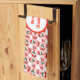 Festive Christmas pattern featuring red stockings, holly leaves, berries, and snowflakes.