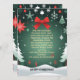 This festive Christmas design features a bright red bow, hanging ornaments, snowflakes, and snowy pine trees on a deep green background. The center area is perfect for adding custom text like “Merry Christmas”, “Happy Holidays”, “Season’s Greetings”, “Winter Wonderland”, or personalized names and messages. Ideal for holiday cards, posters, invitations, and gifts.