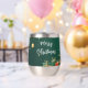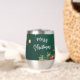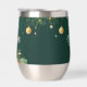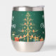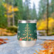 This thermal tumbler features a beautifully decorated Christmas tree adorned with golden ornaments and twinkling lights. The tree is surrounded by an array of colourful gift boxes, each wrapped with ribbons and bows, creating a joyful and celebratory atmosphere. The background is a rich green, complemented by hanging golden baubles and stars, adding a touch of elegance and warmth.