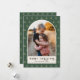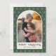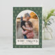 Modern and stylish, Christmas trees arch photo frame holiday greeting card in green and gold. Christmas tree design of gold squares and geometric tile pattern.