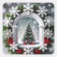 A festive arrangement featuring a snowy window adorned with white snowflakes, vibrant green pine trees, and classic red holiday decorations, creating a picturesque seasonal setting.