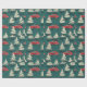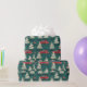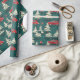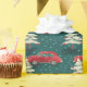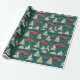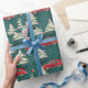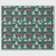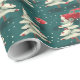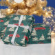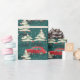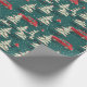 A delightful pattern featuring red cars driving among snowy pine trees, set against a rich green background, capturing the spirit of the holiday season and joy of gift-giving.