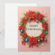 Bright and cheerful Christmas wreath adorned with vibrant poinsettias, glittering ornaments, snowflakes, and ribbons on a warm soft background symbolising holiday joy and celebrations.