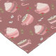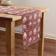 A festive Holiday table runner in a burgundy-colour with the pattern of pink cocoa mugs doodles some candy canes , marshmallows and Christmas plant samples . It is available in three different sizes . Pick the one that fits your table best .