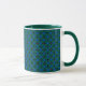 A festive white Ringer Mug, with a pattern on Holly on a light blue background.