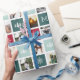 Make your holiday gifts stand out with our photo collage wrapping paper, featuring 15 of your favourite square or Instagram photos arranged in a grid layout with alternating squares in spruce green, cranberry red and sage green, adorned with snowflakes, wintry pine trees, and your single initial monogram in white. Each photo measures just under 3 inches square.