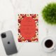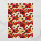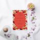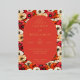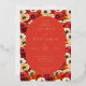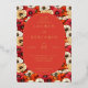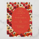 This wedding invitation features a vibrant floral background with large, stylized flowers in shades of red, orange, and cream, creating a lively and colorful atmosphere. The central oval frame is filled with a deep coral color, providing a striking contrast to the busy backdrop. Elegant serif typography is used for the text, which is arranged hierarchically within the frame, conveying formality and sophistication. The overall design combines traditional elements with a modern color palette, evoking a sense of celebration and joy, perfect for a festive and inviting occasion.